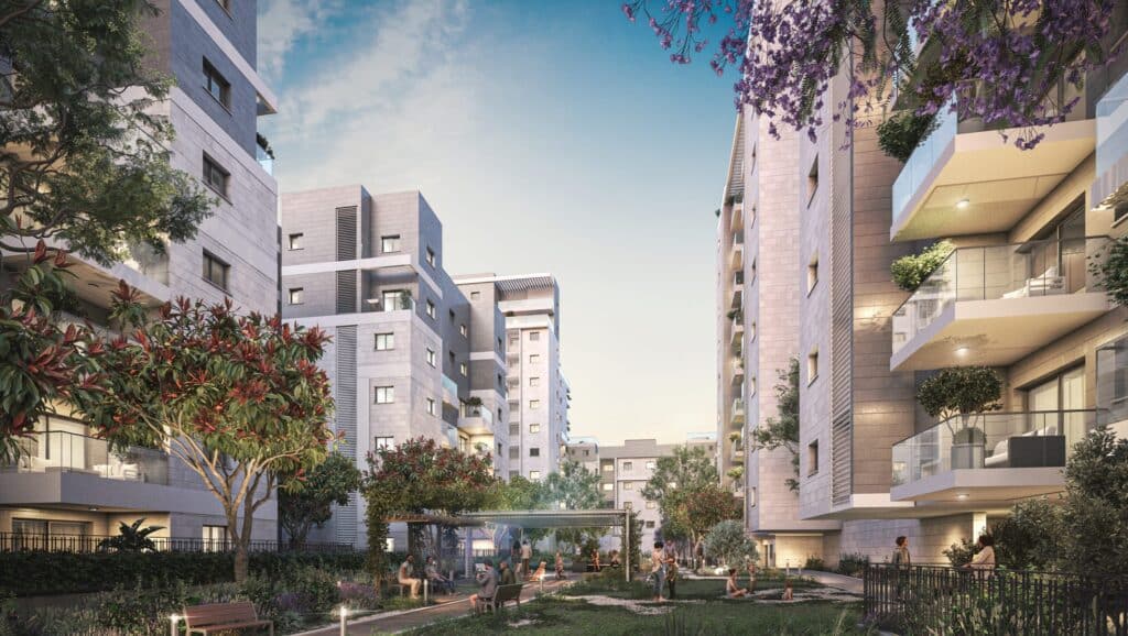 • בין הבניינים יש גינות פנימיות מתוכננות לדיירים